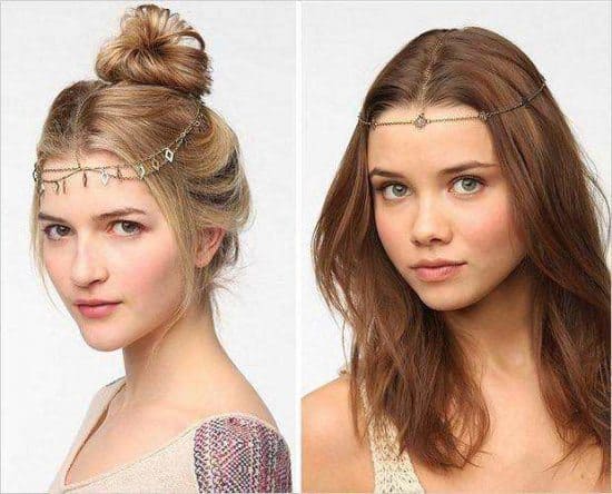 Chain hair accessories can be added to yesterdays blow out or a messy top bun. Check out this gold headpiece from Urban Outfitters to get this look.